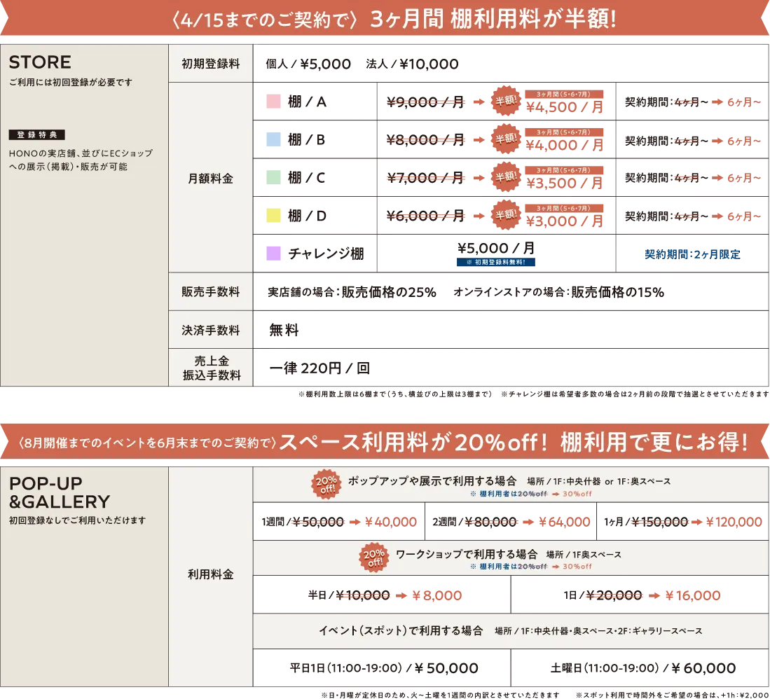 HONOでは利用者様(ブランド)と商品の説明を記載した規定のPOPをご用意しています。それ以外にも追加でPOPが必要な場合には、ご自身でご準備いただき展示することも可能です。但し、ご自身のスペースの範囲内でお願いいたします。